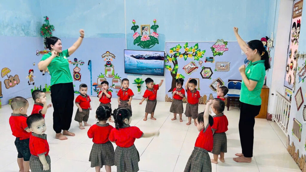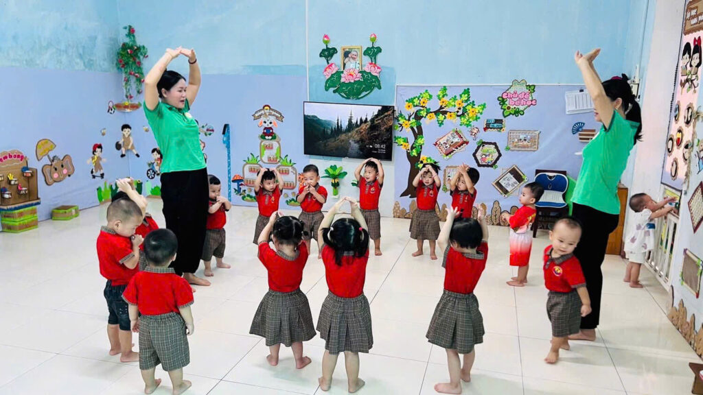 Các bạn lớp Sơn Ca đi học khóc nhè phải không? Không đâu ạ, các con đang còn bận tập thể dụng cùng cô giáo và đi tham quan các lớp trong trường đây này
