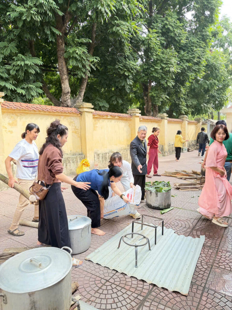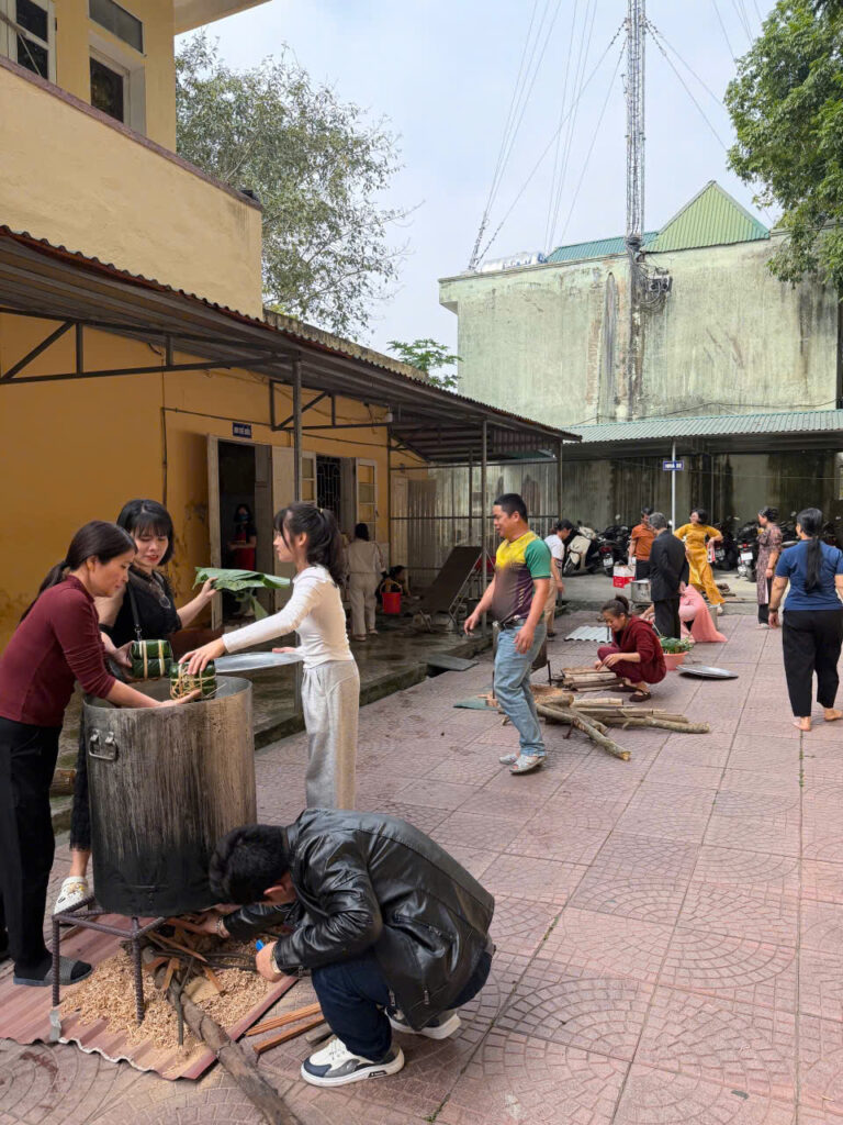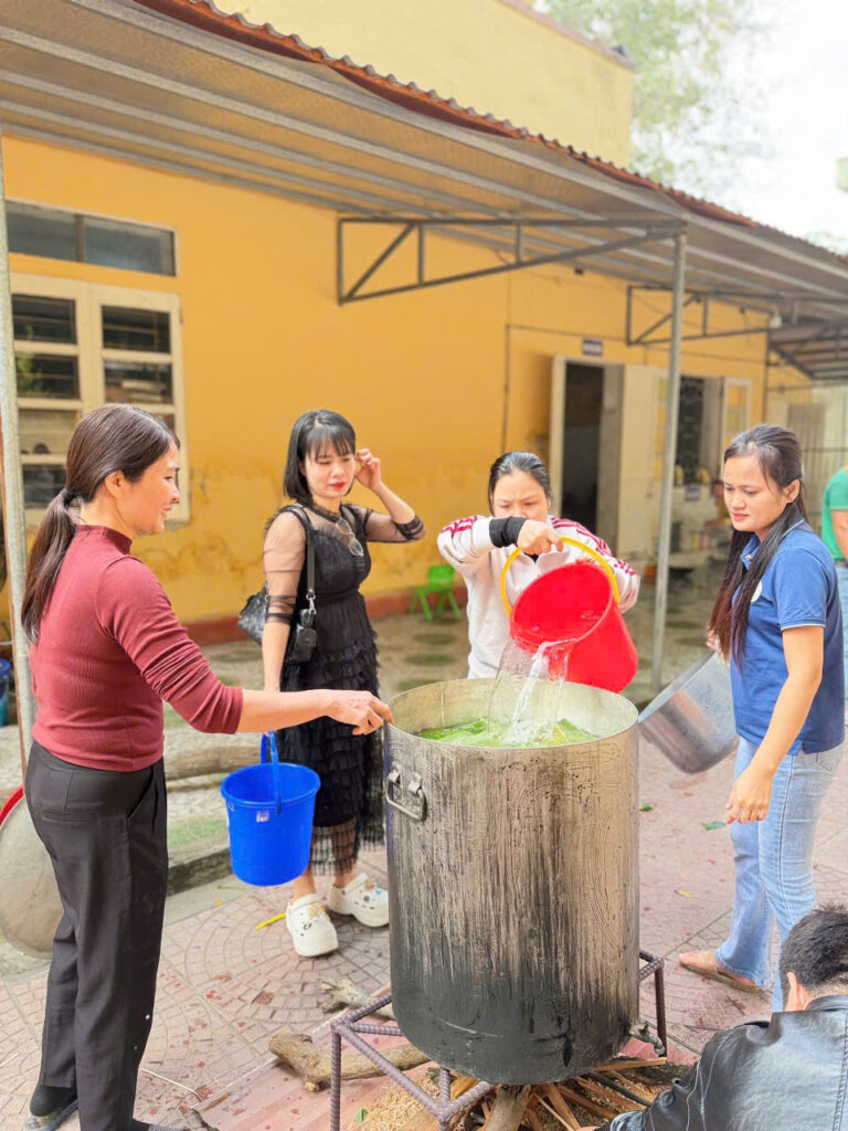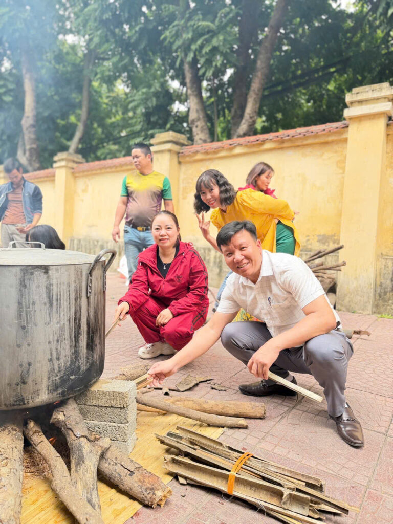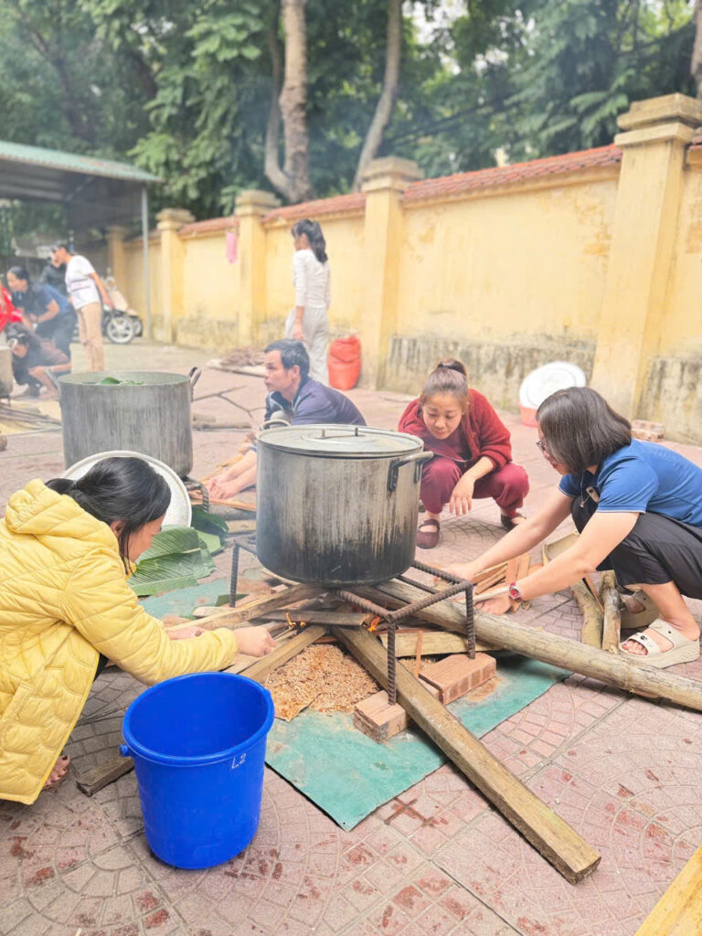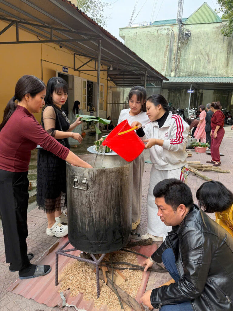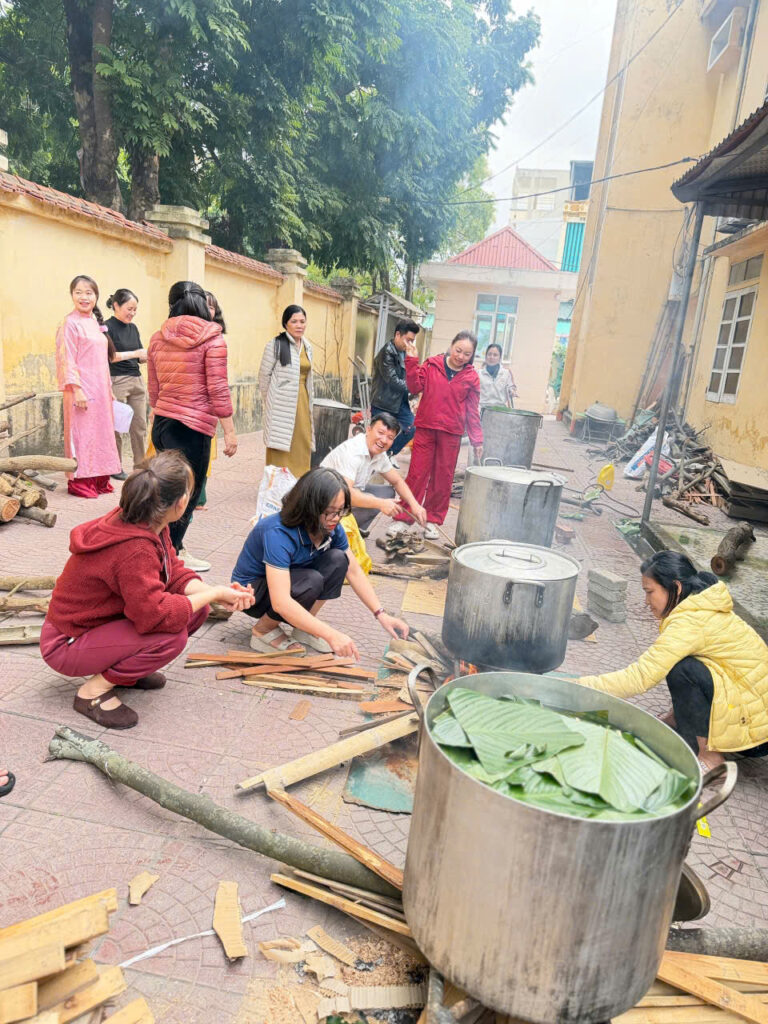 Ngay từ sáng sớm, sân trường đã được trang trí rực rỡ với cờ hoa, câu đối đỏ và những chậu quất, cành đào khoe sắc. Khu vực gói bánh được bố trí gọn gàng với đầy đủ nguyên liệu: lá dong xanh mướt, nếp trắng thơm, đỗ xanh vàng óng, thịt ba chỉ tươi ngon cùng những chiếc khuôn vuông vắn. Tất cả tạo nên một không gian Tết cổ truyền ấm cúng và sinh động.