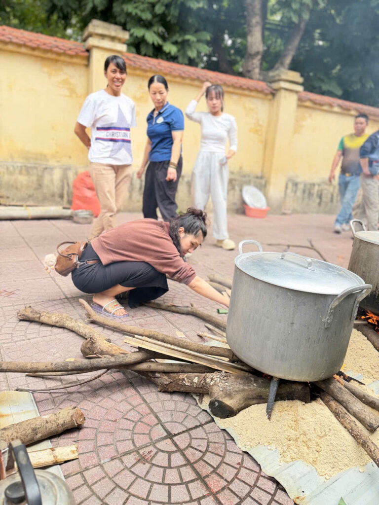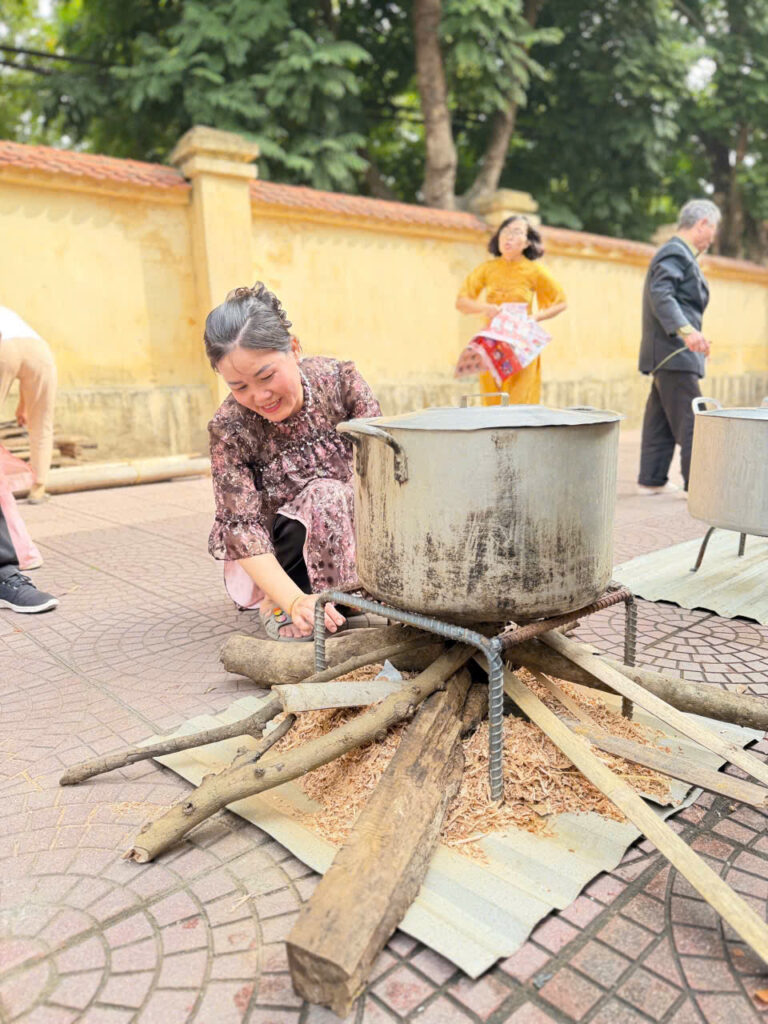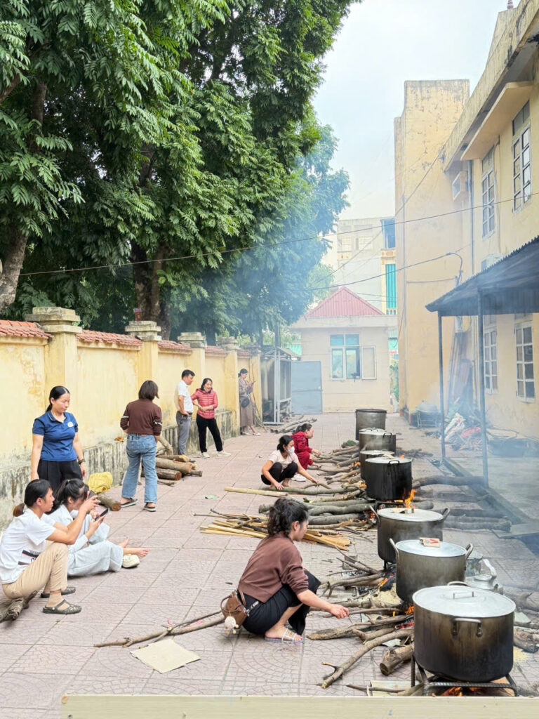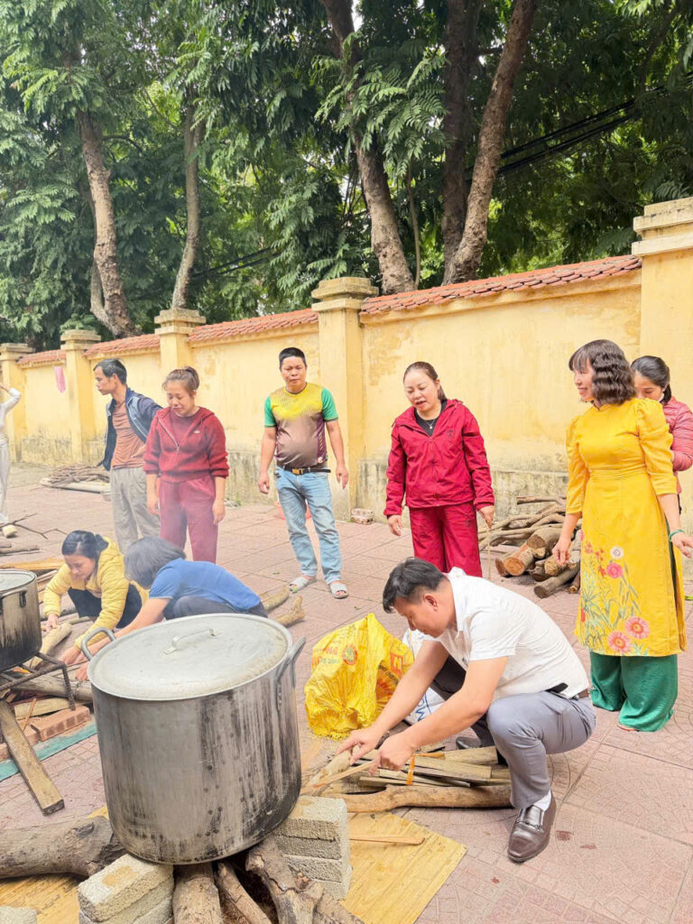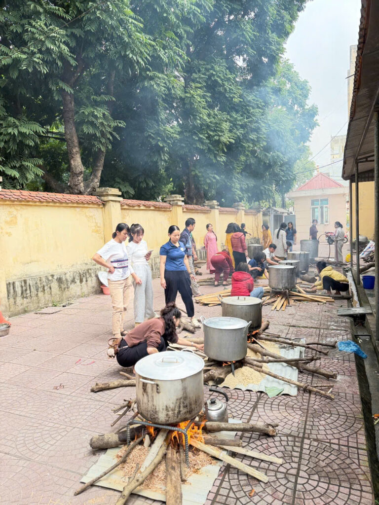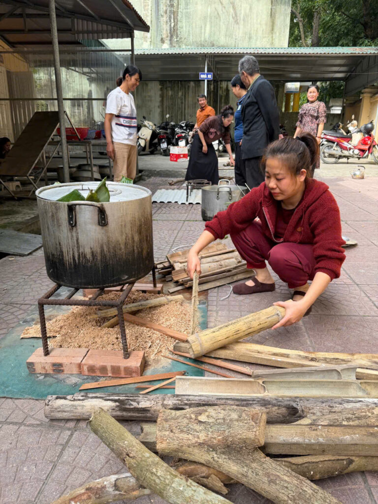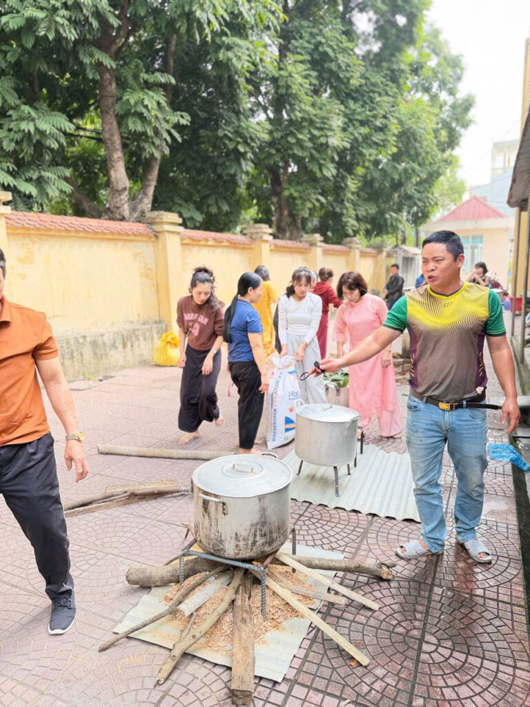 Ngay từ sáng sớm, sân trường đã được trang trí rực rỡ với cờ hoa, câu đối đỏ và những chậu quất, cành đào khoe sắc. Khu vực gói bánh được bố trí gọn gàng với đầy đủ nguyên liệu: lá dong xanh mướt, nếp trắng thơm, đỗ xanh vàng óng, thịt ba chỉ tươi ngon cùng những chiếc khuôn vuông vắn. Tất cả tạo nên một không gian Tết cổ truyền ấm cúng và sinh động.