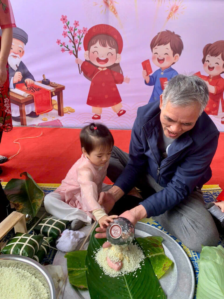 Dưới sự hướng dẫn tận tình của các cô giáo và sự hỗ trợ của phụ huynh, các bé được trực tiếp tham gia vào từng công đoạn: lau lá, đong gạo, xúc đỗ, xếp nhân và gói bánh. Dù đôi bàn tay còn nhỏ xíu, vụng về, nhưng ánh mắt em nào cũng ánh lên sự háo hức và tự hào khi tự tay hoàn thành chiếc bánh chưng đầu đời của mình.